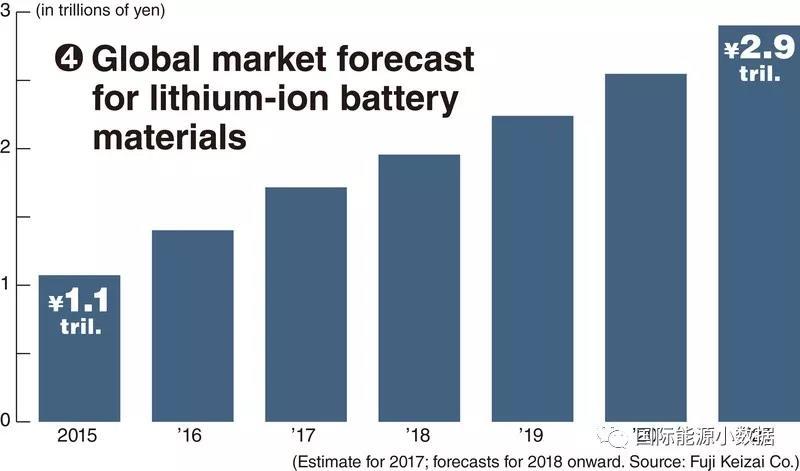 2015年全球鋰電池原料市場(chǎng)為1.1萬億日元(100億美元),預(yù)計(jì)2021年市場(chǎng)規(guī)模達(dá)到2.9萬億日元(260億美元)。