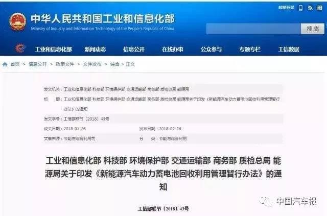 據(jù)悉,在新能源汽車動(dòng)力蓄電池退役潮還沒來臨時(shí),國家及相關(guān)部門已經(jīng)從頂層開始了動(dòng)力蓄電池的溯源體系建設(shè)。今年,《新能源汽車動(dòng)力蓄電池回收利用管理暫行辦法》等與動(dòng)力蓄電池相關(guān)的政策法規(guī)陸續(xù)推出,表明我國政府對動(dòng)力蓄電池回收利用問題高度重視,并走出規(guī)范管理的第一步。