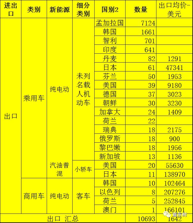 17年6月的新能源乘用車出口主要是孟加拉、韓國、美國、印度等市場,部分小于4位數(shù)的出口單價(jià)就不寫上為好。由于總體單價(jià)在1642美元,檔次不是很高。