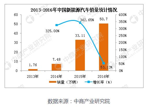 據(jù)中國汽車工業(yè)協(xié)會統(tǒng)計數(shù)據(jù)顯示,2016年,中國新能源汽車銷售50.7萬輛,比上年同期增長53.1%。其中,純電動汽車銷量為40.9萬輛,比上年同期增長65.1%;插電式混合動力汽車銷量為9.8萬輛,比上年同期增長17.1%。