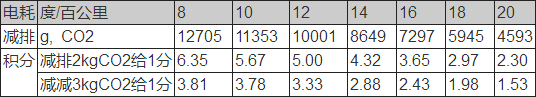 如百公里每減排2kg或3kgCO2給積分1分,積分見下表: