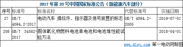 9月29日,國標(biāo)委發(fā)布2017年第23號(hào)中國國家標(biāo)準(zhǔn)公告,共批準(zhǔn)237項(xiàng)國家標(biāo)準(zhǔn)。其中包括《電動(dòng)汽車操縱件、指示器及信號(hào)裝置的標(biāo)志》、《固體氧化物燃料電池單電池和電池堆性能試驗(yàn)方法》兩項(xiàng)國標(biāo)。
