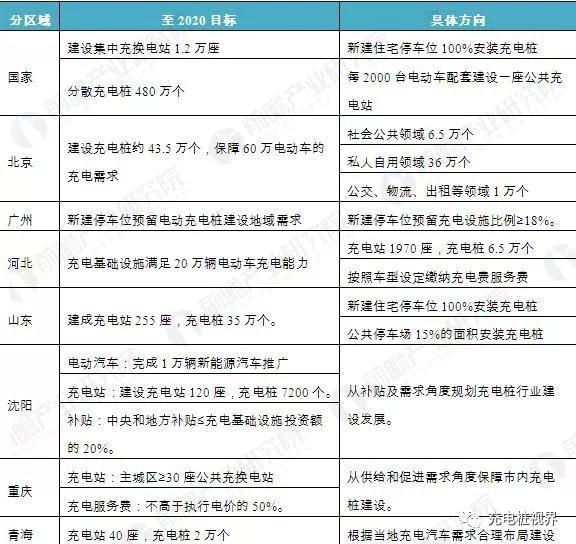 在國(guó)家政策和各省市新能源汽車產(chǎn)銷量的影響下,國(guó)內(nèi)代表性地區(qū)紛紛制定出到2020年省市充電樁的建設(shè)目標(biāo),從國(guó)家層面至2020年集中建設(shè)交換電樁1.2萬座,布局于公共場(chǎng)所等的分散充電樁480萬個(gè),其他省市均從電動(dòng)汽車的推廣、充電樁的建設(shè)和充電服務(wù)費(fèi)角度規(guī)劃充電樁的建設(shè)布局。
