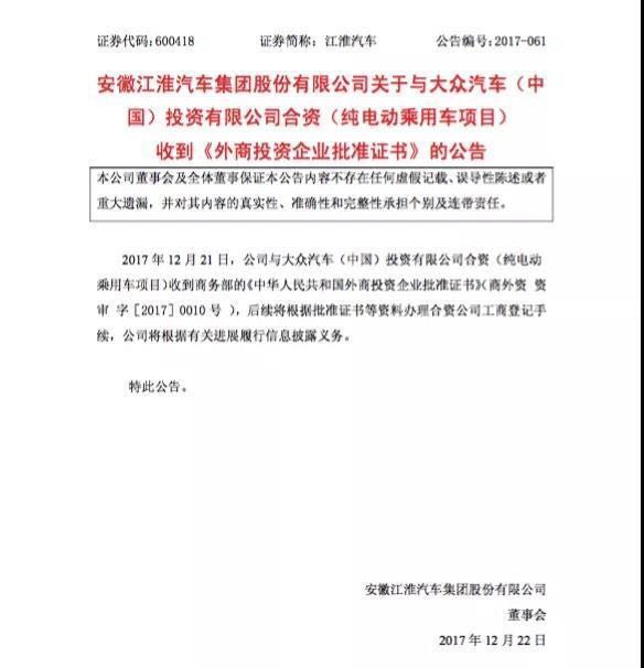距離9月7日江淮汽車發(fā)布公告,稱與大眾正式簽署合資合作諒解備忘錄,將在新能源領(lǐng)域成立一家合資公司后不足4個月,這一合資項目便火速獲得商務(wù)部的批準?! “不战雌嚬煞萦邢薰荆?00418,SH)在2