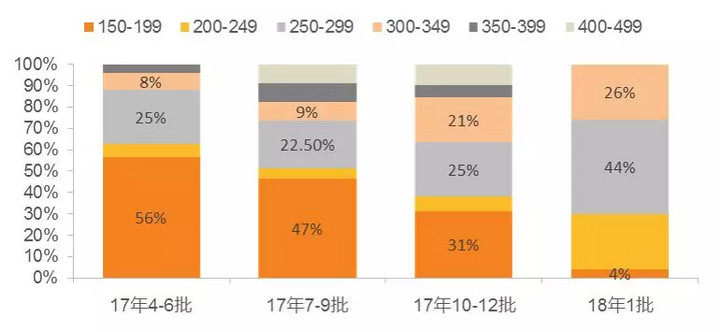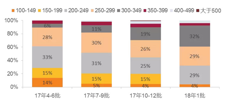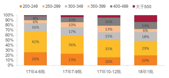 2017年的《目錄》中,續(xù)航里程為150-199公里的乘用車占比就有逐漸下降的趨勢(shì),而本目錄中續(xù)航里程低于200公里的乘用車型只有1款,這與此前市場(chǎng)預(yù)計(jì)的新政策將重點(diǎn)減少對(duì)低續(xù)航里程的A00小車的補(bǔ)貼相吻合。而專用車與客車的續(xù)航里程變化并不明顯。