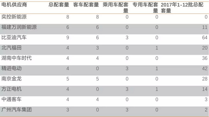 電機(jī)供應(yīng)商集中度一直較低,此次《目錄》中的車型也不例外,甚至較以往更為分散。其中表現(xiàn)相對(duì)較好的為精進(jìn)電動(dòng)和方正電機(jī)。奕控新能源由于配套了申龍客車,因而配套量顯著領(lǐng)先。