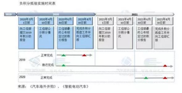 不過,依據(jù)雙積分政策中“2019年度產(chǎn)生的新能源汽車正積分可以等額結轉一年”、“乘用車企業(yè)2019年度產(chǎn)生的新能源汽車負積分,可以使用2020年度產(chǎn)生的新能源汽車正積分進行抵償”的相關規(guī)定,如果負積分企業(yè)在2019年積分核算情況報告發(fā)布后的60天內(nèi),無法完成負積分的抵償,企業(yè)仍然可以采用靈活機制,使用2020年度產(chǎn)生的新能源汽車正積分進行抵償,這樣的話,實際上2019年有負積分的企業(yè)可以采用借貸后一年的積分靈活措施,一直等到2021年的6月30日時工信部公布2020年當年的積分核算報告后的60天內(nèi),也就是2021年的8月30日前,才必須完成2019年和2020年兩年的負積分抵償任務了。