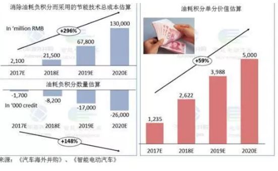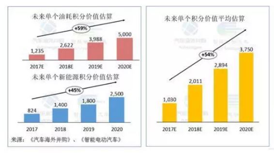 由此推算,為消除單個油耗負積分需要投入的金額從2017年的1200元左右將猛增到2020年的5000元左右,年復合增產(chǎn)率為59%。