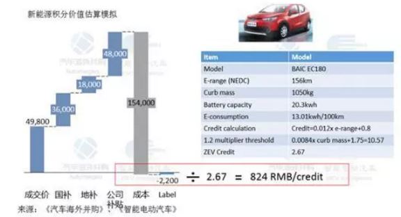 以2017年純電動汽車的銷售冠軍北汽EC180為例,新生產(chǎn)的新能源汽車的積分價值相當于在銷售汽車之外的額外期待收益,通常用汽車的成交價+補貼政策紅利-總成本(成本基于調研數(shù)據(jù)粗略估算,許多新能源汽車的生產(chǎn)仍然處于虧損狀態(tài),沒有了補貼將虧損更多),有大概2200元的差距。根據(jù)EC180的技術參數(shù)核算后的單車新能源積分為2.67分(不滿足1.2倍積分的電耗門檻10.57kwh/100km),單個新能源積分的價值估算為824元。