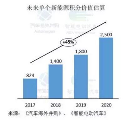 單個新能源積分價值1000元左右只是基于目前的情況進行推演的結果。隨著2019年雙積分政策開始考核、補貼加速退坡以及由各種技術門檻提高帶來的總成本的大幅提升,預計未來單個新能源積分的價值將持續(xù)提高,粗略估計從目前的不足一千元逐漸上漲到2500元左右。