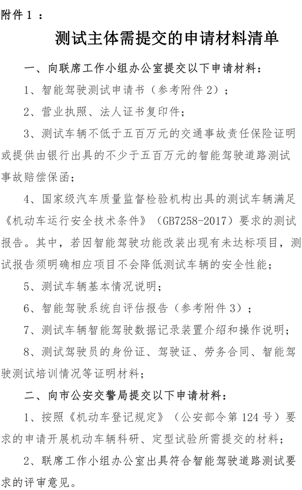 5、測試主體應(yīng)按要求提供申請材料(參考附件1、附件2和附件3),并對所提交材料的真實性、合法性負(fù)責(zé)。同時,相應(yīng)測試車輛、測試駕駛?cè)藨?yīng)達(dá)到測試基本要求。