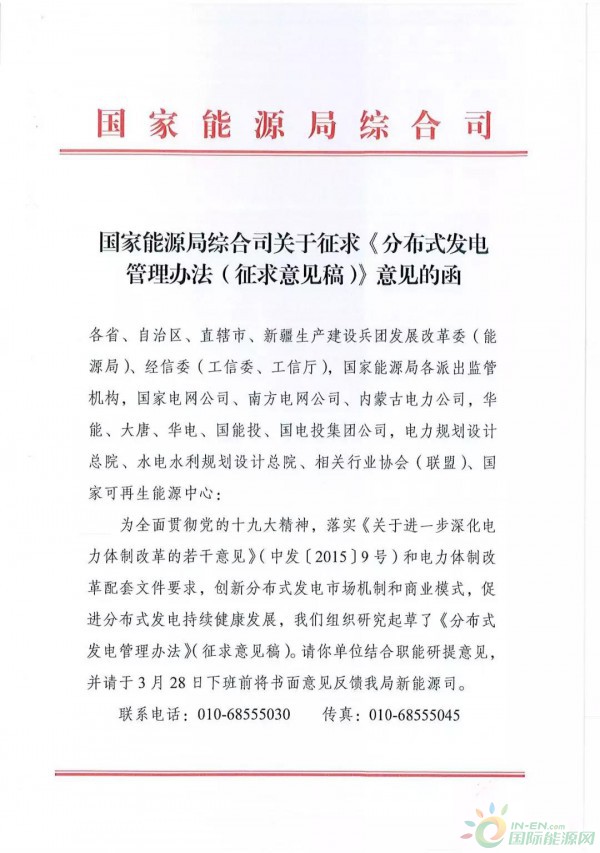 3月20日,國家能源局綜合司關(guān)于《分布式發(fā)電管理辦法(征求意見稿)》意見的函。