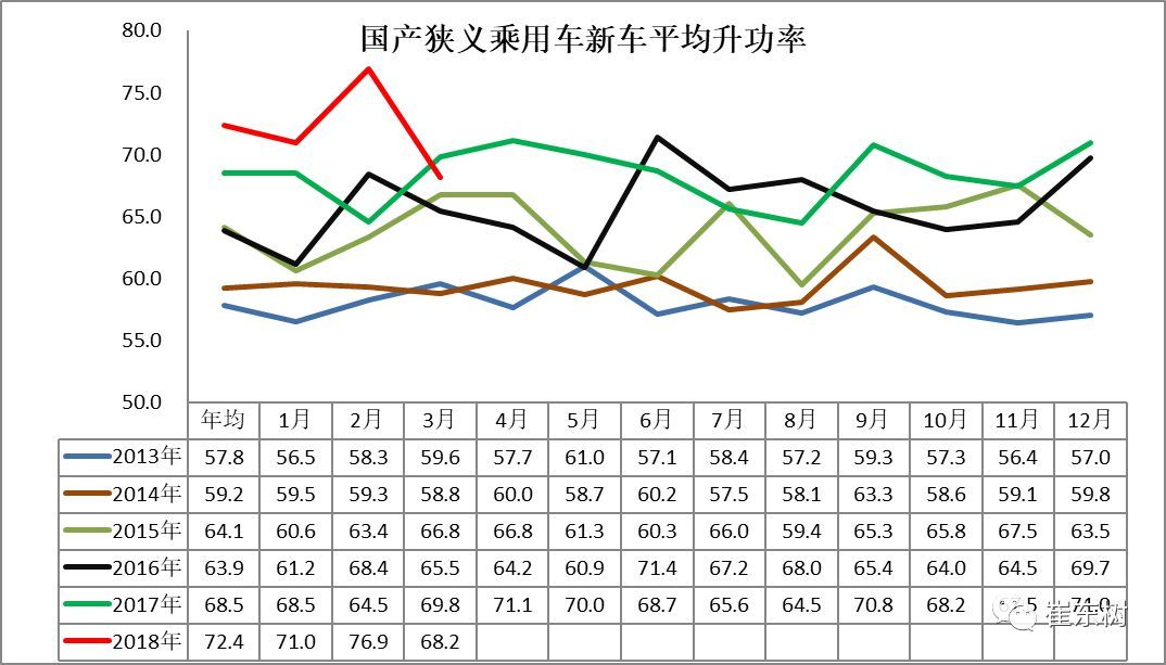 從發(fā)動(dòng)機(jī)動(dòng)力與油耗的均衡走勢(shì)看,近幾年來的油耗和動(dòng)力提升的均衡管理效果突出。15年的的油耗保持在93%,但新車的平均功率達(dá)到64千瓦,整車企業(yè)的技術(shù)進(jìn)步效果較突出。16年的功率狀態(tài)維持在到63.9千瓦/升,油耗也降到4階段的132%;17年的升功率69,油耗132%,油耗動(dòng)力綜合表現(xiàn)較強(qiáng),但與外界的發(fā)展速度有所差距。18年3月的新品的動(dòng)力性也不是很強(qiáng)。