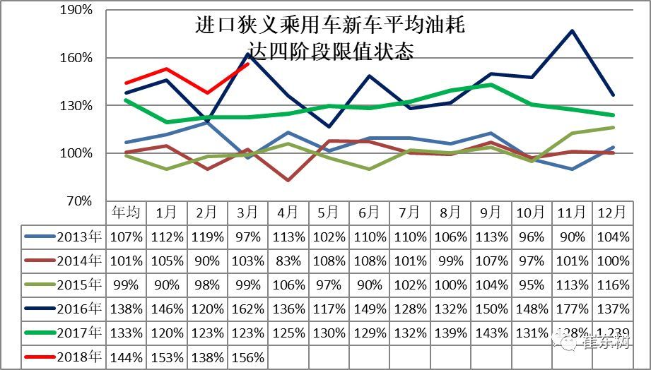 14年的進(jìn)口車新品的平均油耗為101%,15年的新品油耗達(dá)到99%的稍有改善,16年進(jìn)口車申報(bào)車型的平均油耗是四階段目標(biāo)的138%的較高狀態(tài),17年又迅速降到133%。。17年油耗降低較好。但18年年初油耗偏高,3月的新車油耗為4階段156%,中大型豪華車較多。