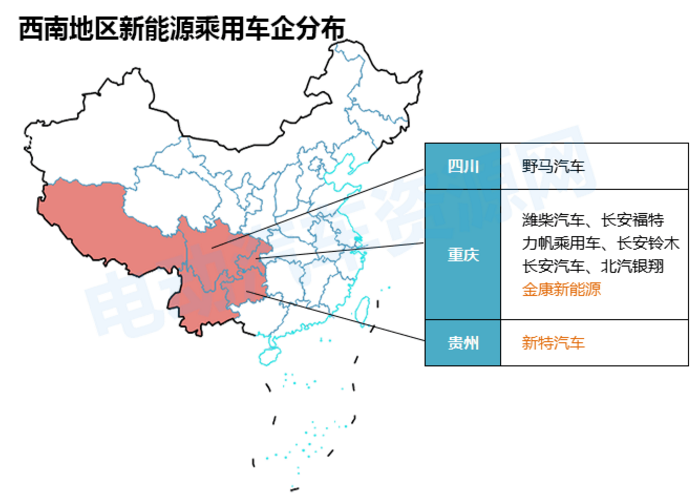 西南地區(qū)共包含四川省、貴州省、云南省、重慶市、西藏自治區(qū)5個省市,新能源乘用車企業(yè)接近10家。其中重慶是西南地區(qū)新能源乘用車最多的地區(qū),同時小康股份旗下的純電動乘用車項目金康新能源也在重慶。
