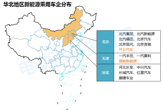 華北地區(qū)包括北京市、天津市、山西省、河北省、內(nèi)蒙古自治區(qū)五個省市,共計新能源乘用車企業(yè)近20家。其中北京地區(qū)車企最多,主要為北汽集團的關(guān)聯(lián)車企業(yè)。