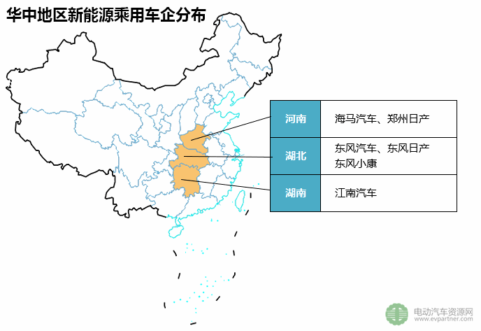 華中地區(qū)共有河南、湖南、湖北三省,共計新能源乘用車企業(yè)5家。其中,河南有海馬汽車和鄭州日產(chǎn),湖北有東風汽車、東風日產(chǎn)以及東風小康;而湖南只有一家江南汽車,也就是眾泰汽車。