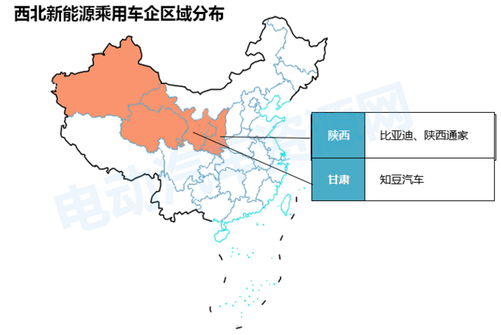 西北地區(qū)共包括陜西省、甘肅省、青海省、寧夏回族自治區(qū)、新疆維吾爾自治區(qū)5個省市及自治區(qū),但西北地區(qū)中陜西省內(nèi)有2家新能源乘用車企業(yè),甘肅有一家新能源乘用車企業(yè)。