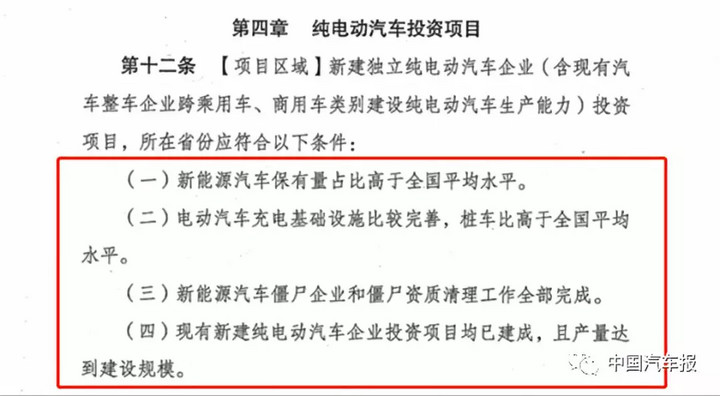 而這四項(xiàng)規(guī)定明晰的條款,則進(jìn)一步提升了新造車(chē)企業(yè)的投資門(mén)檻,尤其是對(duì)于那些綁定了地方政府的項(xiàng)目,如果所在省份不滿(mǎn)足這些基礎(chǔ)條件,是不具備資格建立純電動(dòng)汽車(chē)投資項(xiàng)目的,即便是已經(jīng)拿到入場(chǎng)券的入局者,也可能面臨著被清退的危險(xiǎn)。