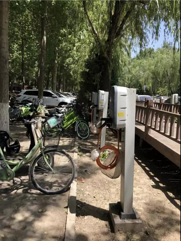 反復(fù)被用戶詬病的充電樁問題,在這里同樣無一幸免。許多充電樁的接口被灰塵和柳絮堵塞,長久無人使用。在靠近出口的地方雖然也有一些新能源汽車在充電,但大多被燃油車、共享單車占用了停車位,無法使用的充電樁也隨處可見。