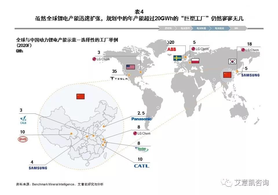 未來幾年內(nèi),全球的動力鋰電產(chǎn)能將迅速擴(kuò)張并在2020年達(dá)到180GWh,中國將是全球產(chǎn)能擴(kuò)張最迅速的國家;預(yù)計(jì)到2020年,中國的動力鋰電產(chǎn)能將達(dá)全球的60―65%之間;美國的產(chǎn)能將排名全球第二。