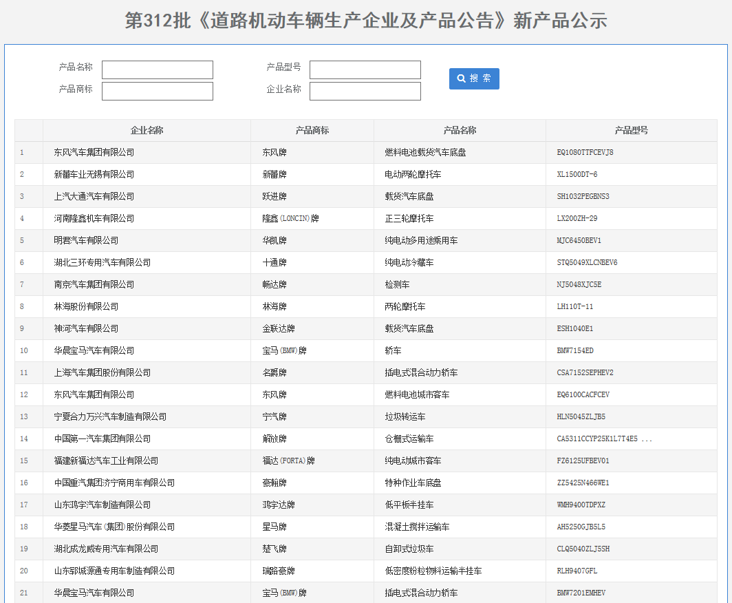 工信部公示第312批新車(chē)產(chǎn)品目錄