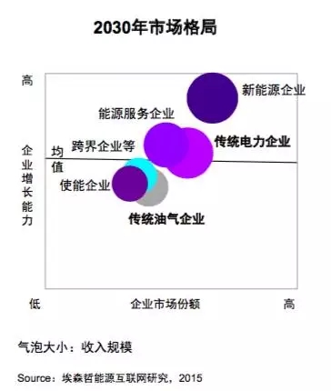 埃森哲預(yù)測,2030 年的中國市場,新能源企業(yè)的增長能力和市場份額都將超過傳統(tǒng)能源企業(yè),而能源服務(wù)企業(yè)、 使能企業(yè)和跨界企業(yè)也將憑借能源互聯(lián)網(wǎng)領(lǐng)域帶來的新增長點迅速崛起,甚至趕超傳統(tǒng)油氣企業(yè)。