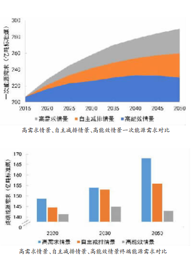能效提升與低碳轉(zhuǎn)型是實(shí)現(xiàn)2攝氏度溫升控制目標(biāo)的“兩個(gè)輪子”。高需求情景下,能源低碳轉(zhuǎn)型是實(shí)現(xiàn)溫控目標(biāo)的主要手段,但投資高、難度大,還要依靠碳捕捉、利用與封存技術(shù)(CCUS)的大范圍應(yīng)用;高能效情景下,雖能效提升較快,但要實(shí)現(xiàn)溫控目標(biāo)也必須大力發(fā)展可再生能源。因此,能效提升與低碳轉(zhuǎn)型是應(yīng)對全球氣候變化的“雙輪驅(qū)動(dòng)”,必須同時(shí)發(fā)力。
