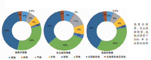發(fā)電裝機(jī)大幅增加,尤其是2030年以后增長顯著。自主減排情景下,全球發(fā)電裝機(jī)由63億千瓦增至216億千瓦,增長約2.4倍,年均增長3.6%,2030年后發(fā)電裝機(jī)增速明顯加快。高需求、高能效情景下,全球發(fā)電裝機(jī)分別增至302億、261億千瓦。