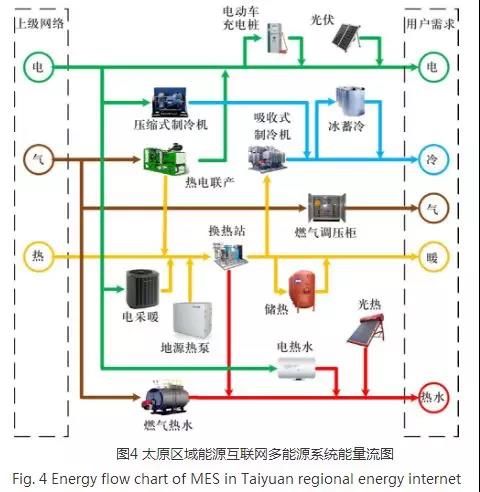 圖4是山西太原科技創(chuàng)新城多能源系統(tǒng)能量流圖。區(qū)域能源互聯(lián)網(wǎng)綜合了電、氣、熱、冷各類能源,融合了各類新能源、新技術(shù),以實(shí)現(xiàn)多種能源間協(xié)同互補(bǔ),提高整體能源利用率。太原區(qū)域能源互聯(lián)網(wǎng)多能源系統(tǒng)中電、熱、冷、生活熱水的供應(yīng)渠道及相應(yīng)的價(jià)值創(chuàng)造如下。