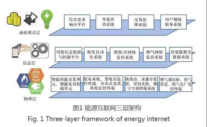 能源互聯(lián)網(wǎng)在縱向可以劃分為三層,從低層至頂層依次為物理層、信息層和商業(yè)模式層,如圖1所示。能源互聯(lián)網(wǎng)通過(guò)信息能量深度耦合以及多能源系統(tǒng)的廣泛集成,能夠?qū)崿F(xiàn)電能、冷、熱能的高效生產(chǎn)、靈活控制以及智能利用,促進(jìn)可再生能源的大幅接入,實(shí)現(xiàn)開放、靈活互動(dòng)的電能交易形式,能夠深入挖掘用戶需求響應(yīng)潛力,最終整體提高終端能源的使用效率,降低能源生產(chǎn)成本,減少全社會(huì)碳排放量[5]。從能源互聯(lián)網(wǎng)運(yùn)營(yíng)商的角度而言,通過(guò)靈活控制區(qū)內(nèi)能量生產(chǎn)環(huán)節(jié)、降低傳輸環(huán)節(jié)能耗、增強(qiáng)能源供應(yīng)可靠性,利用價(jià)格信號(hào)充分協(xié)調(diào)不同時(shí)間、空間以及能源形式的使用,大幅度提高終端能源生產(chǎn)與利用效率,從而創(chuàng)造額外的商業(yè)價(jià)值;對(duì)用戶而言,能夠通過(guò)合理安排能源利用,降低能源使用費(fèi)用,進(jìn)而降低生產(chǎn)成本;從能源互聯(lián)網(wǎng)投資商的角度,通過(guò)投資能源互聯(lián)網(wǎng)中新能源發(fā)電、冷熱電聯(lián)供、先進(jìn)信息以及控制技術(shù),降低了多能源系統(tǒng)的運(yùn)營(yíng)成本,實(shí)現(xiàn)了充分的收資回報(bào)。