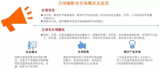 全球輸配電市場——未來隨著智能電網(wǎng)的全面建設(shè),全球輸配電的相關(guān)設(shè)備市場將穩(wěn)步增長,東南亞輸配電市場不僅市場容量大,而且相比北美區(qū)域進入可能性較大。