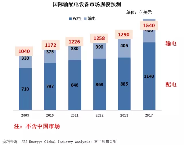 全球輸配電市場規(guī)模——國際輸配電設(shè)備市場至2017年將維持約5%的增長,輸電設(shè)備市場增長緩慢,而配電設(shè)備市場增長較快。