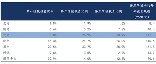 根據(jù)國(guó)家電網(wǎng)規(guī)劃,第三階段智能電網(wǎng)建設(shè)中,變電、配電、用電三個(gè)環(huán)節(jié)占比最大,配電和用電環(huán)節(jié)是重點(diǎn)。發(fā)電、調(diào)式、通信平臺(tái)建設(shè)占比下降。