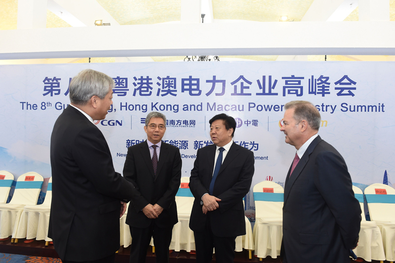 7月26日,第八屆粵港澳電力企業(yè)高峰會(huì)期間,南方電網(wǎng)公司黨組書記、董事長(zhǎng)李慶奎,中國(guó)廣核集團(tuán)有限公司董事長(zhǎng)賀禹,香港中電控股有限公司首席執(zhí)行官藍(lán)凌志,澳門電力公司董事長(zhǎng)傅建國(guó)進(jìn)行親切友好交流。(孫維鋒 攝)