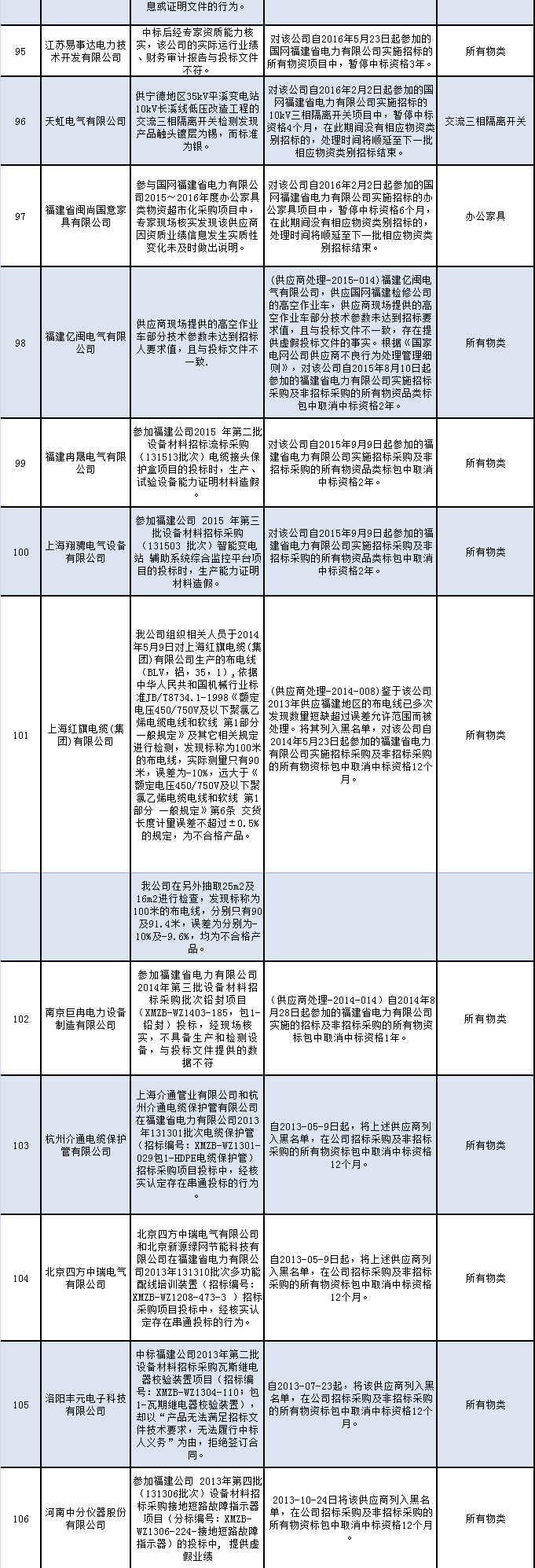 國網(wǎng)福建公司公布的未解除限制供應商名單