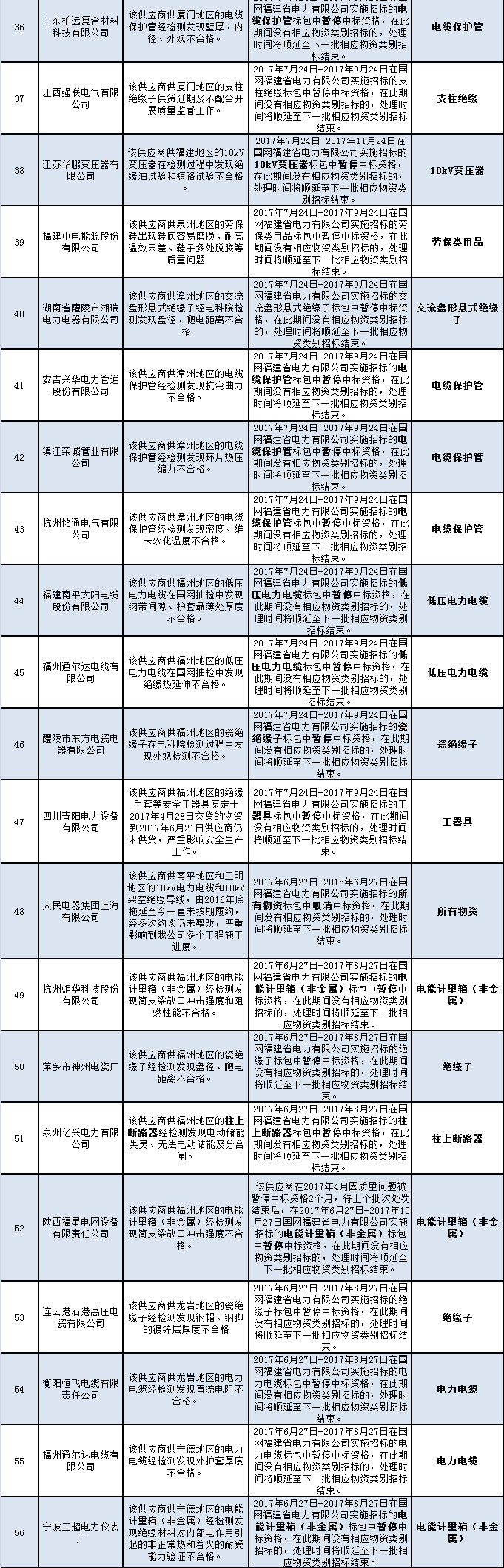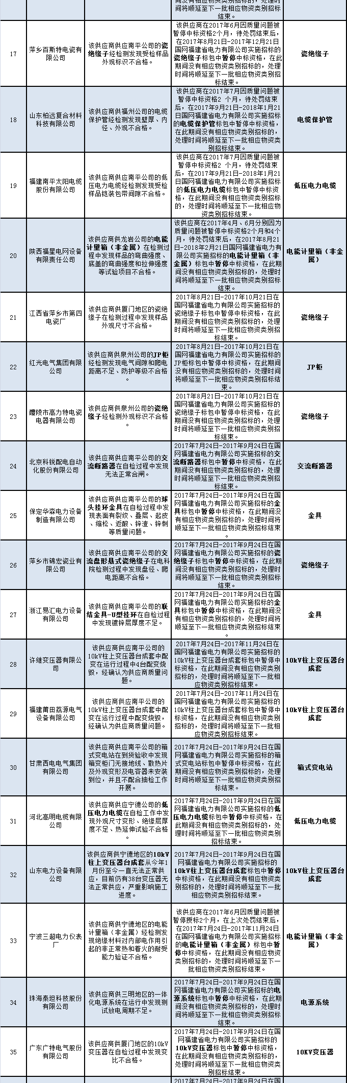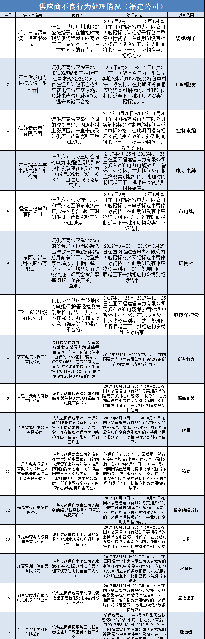 國(guó)網(wǎng)福建公司公布的未解除限制供應(yīng)商名單