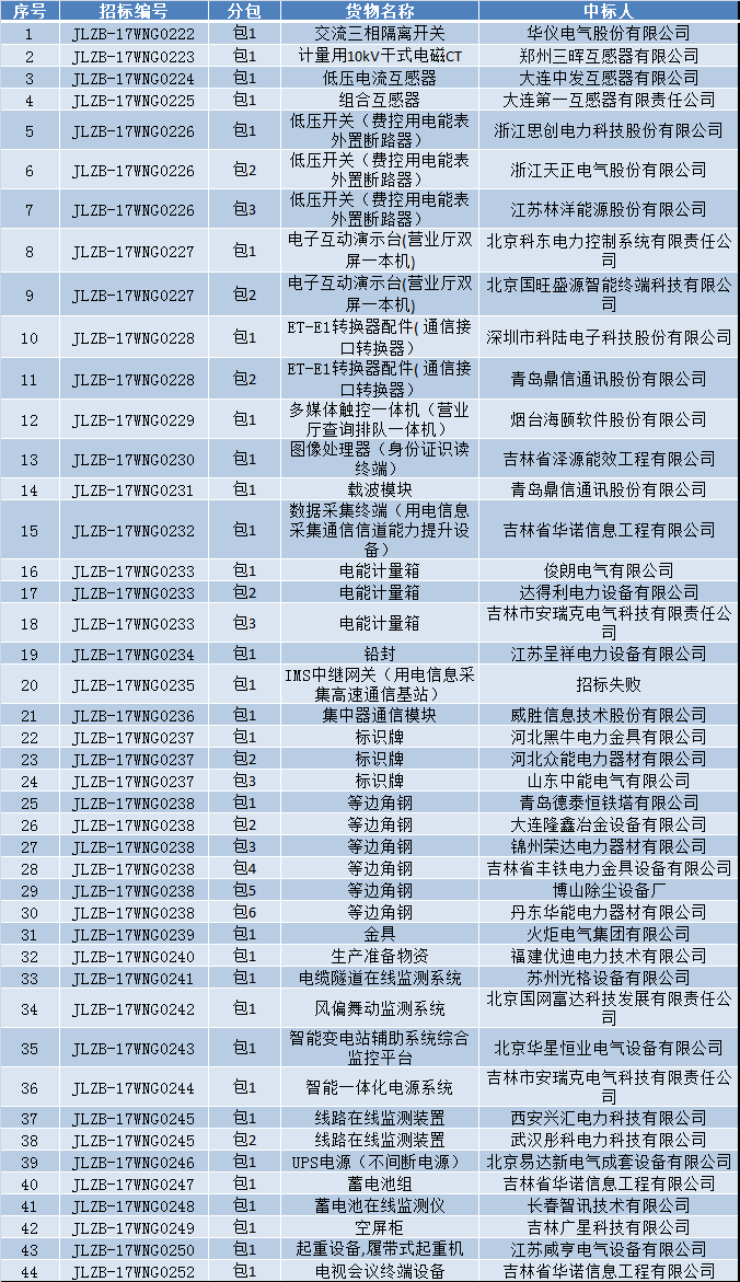 國網(wǎng)吉林省電力有限公司2017年第五批物資集中規(guī)模招標(biāo)采購中標(biāo)公告(招標(biāo)編號:JLZB-17WNG0222-0252)