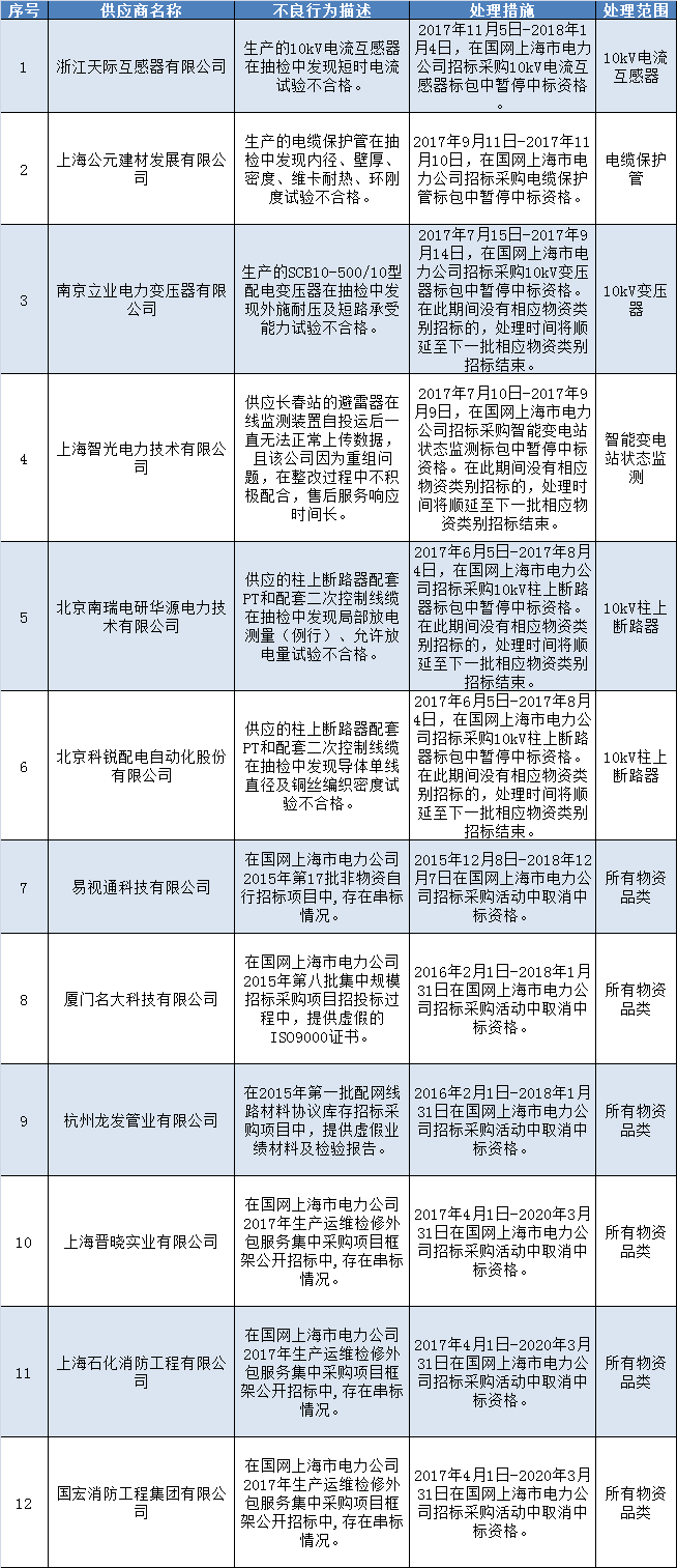 國網(wǎng)上海市電力公司關(guān)于供應(yīng)商不良行為處理情況的通報(2017年11月)